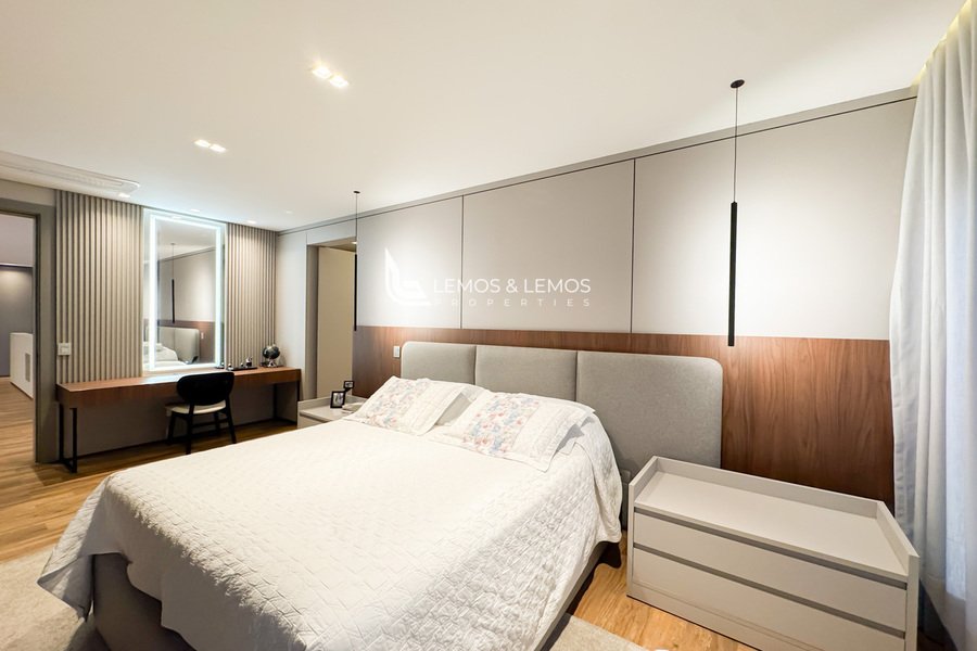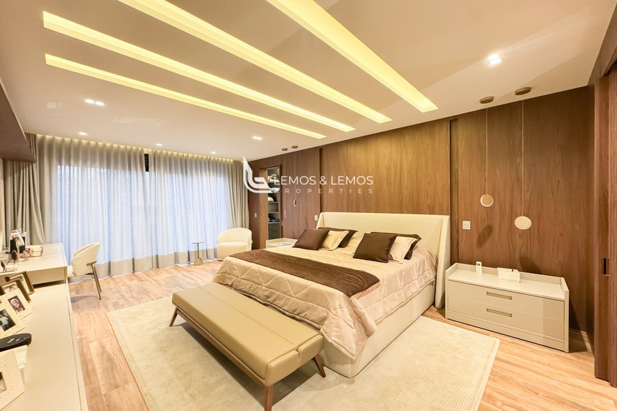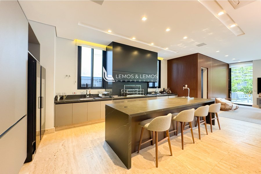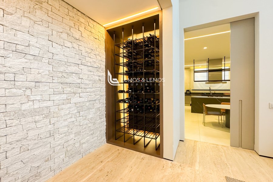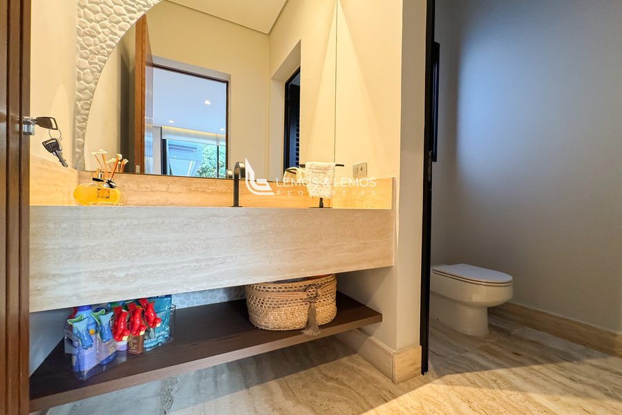 Os ambientes sociais são revestidos em mármore travertino romano bruto, que valoriza ainda mais a imponência dos espaços. A residência une o melhor da arquitetura contemporânea com acabamentos nobres, integrando funcionalidade e estética em todos os detalhes.