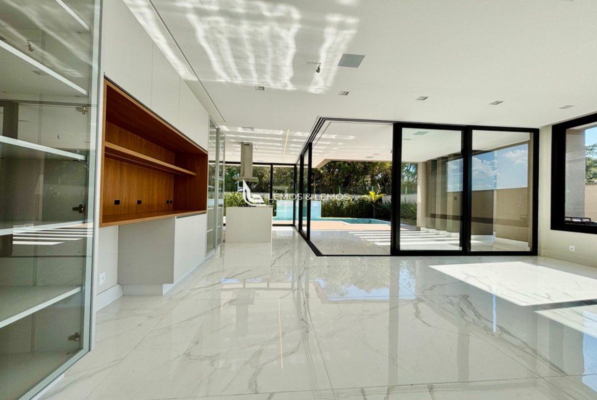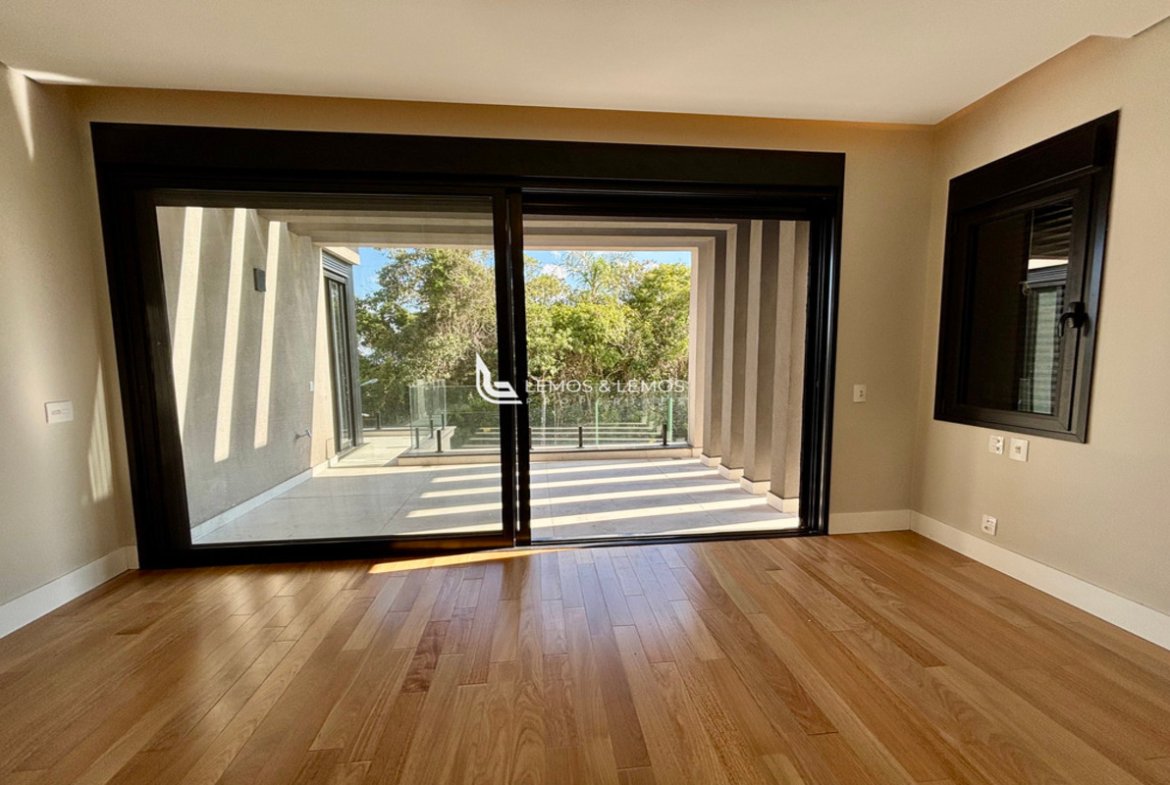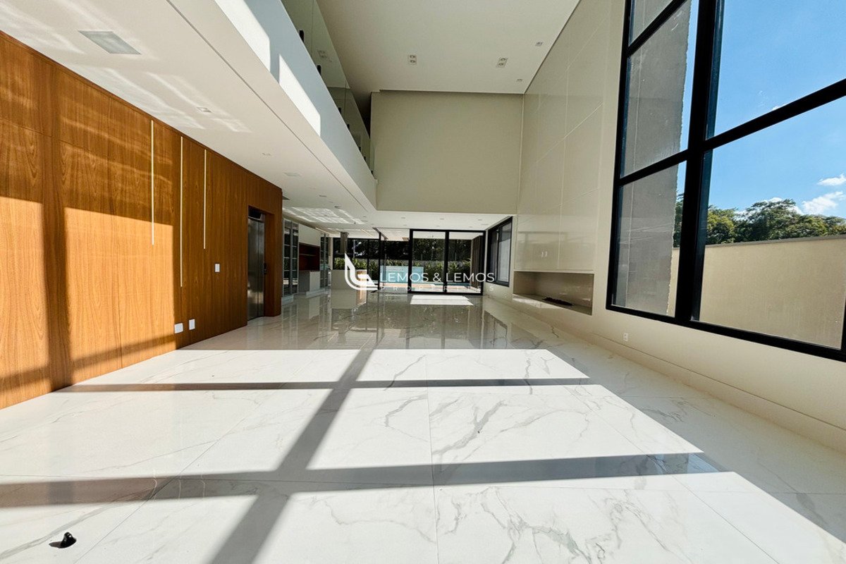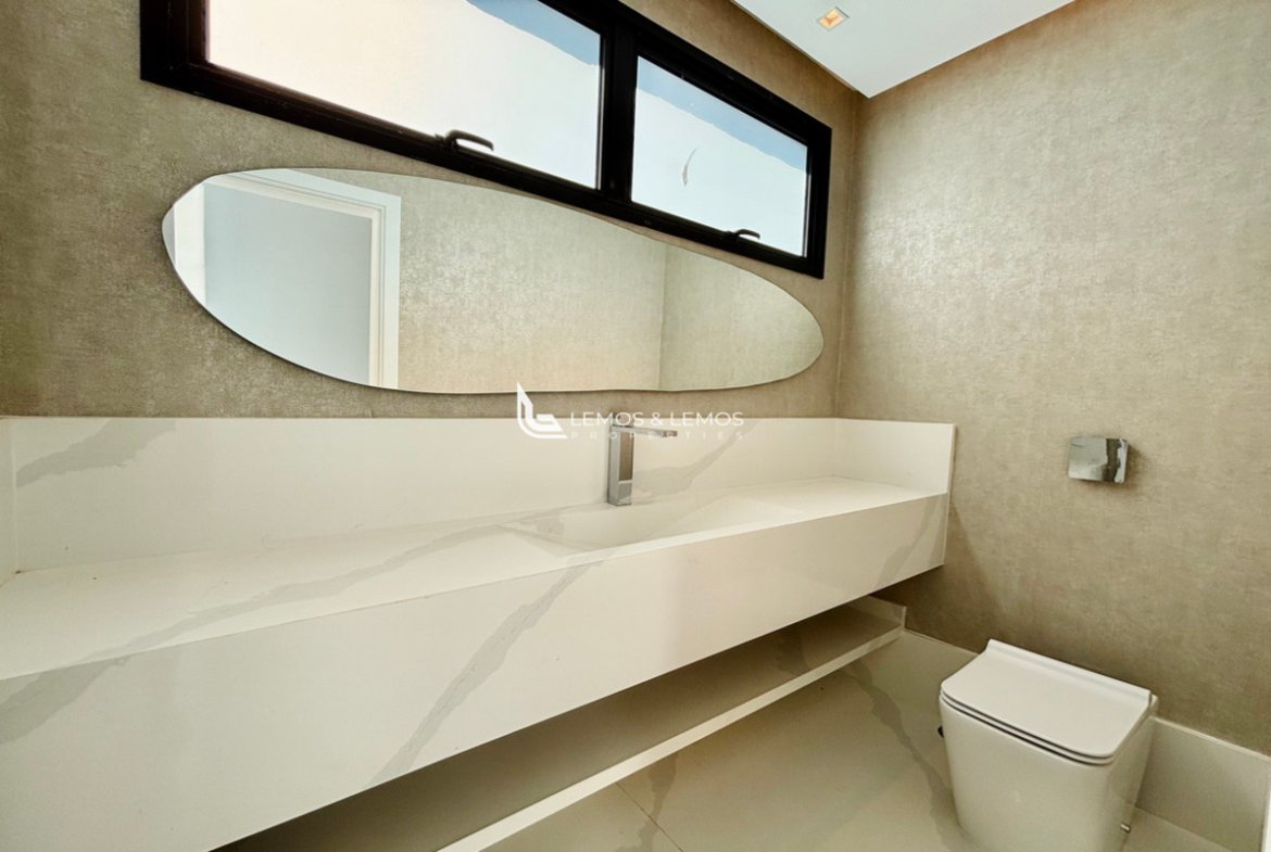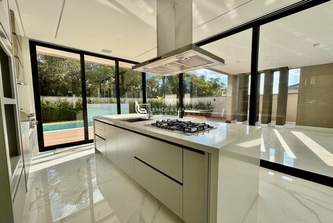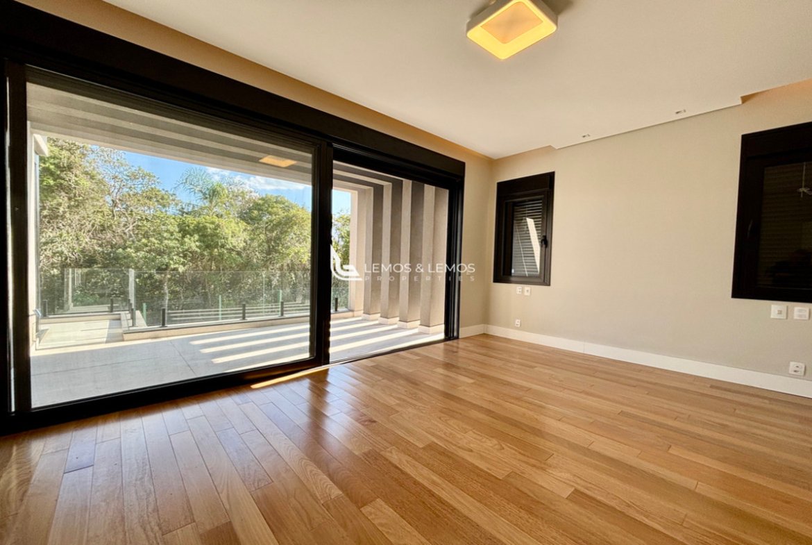 Com 505 m² de terreno e 430 m² de área construída, a casa possui 4 suítes amplas, incluindo uma máster com closet e banheiro Sr. e Sra., living com pé-direito duplo, sala lareira, sala de jantar, escritório, sala íntima, rouparia, além de lavabo e dependência completa para colaborador.