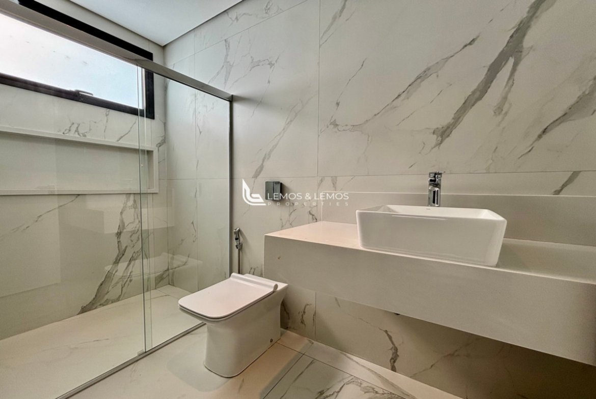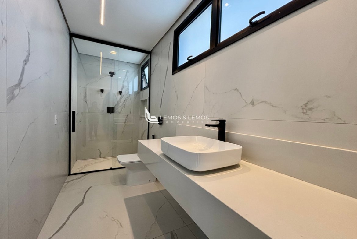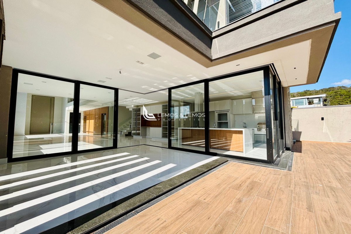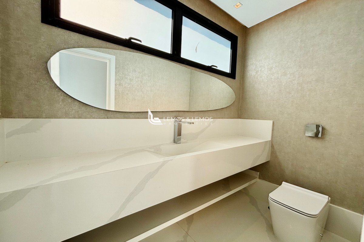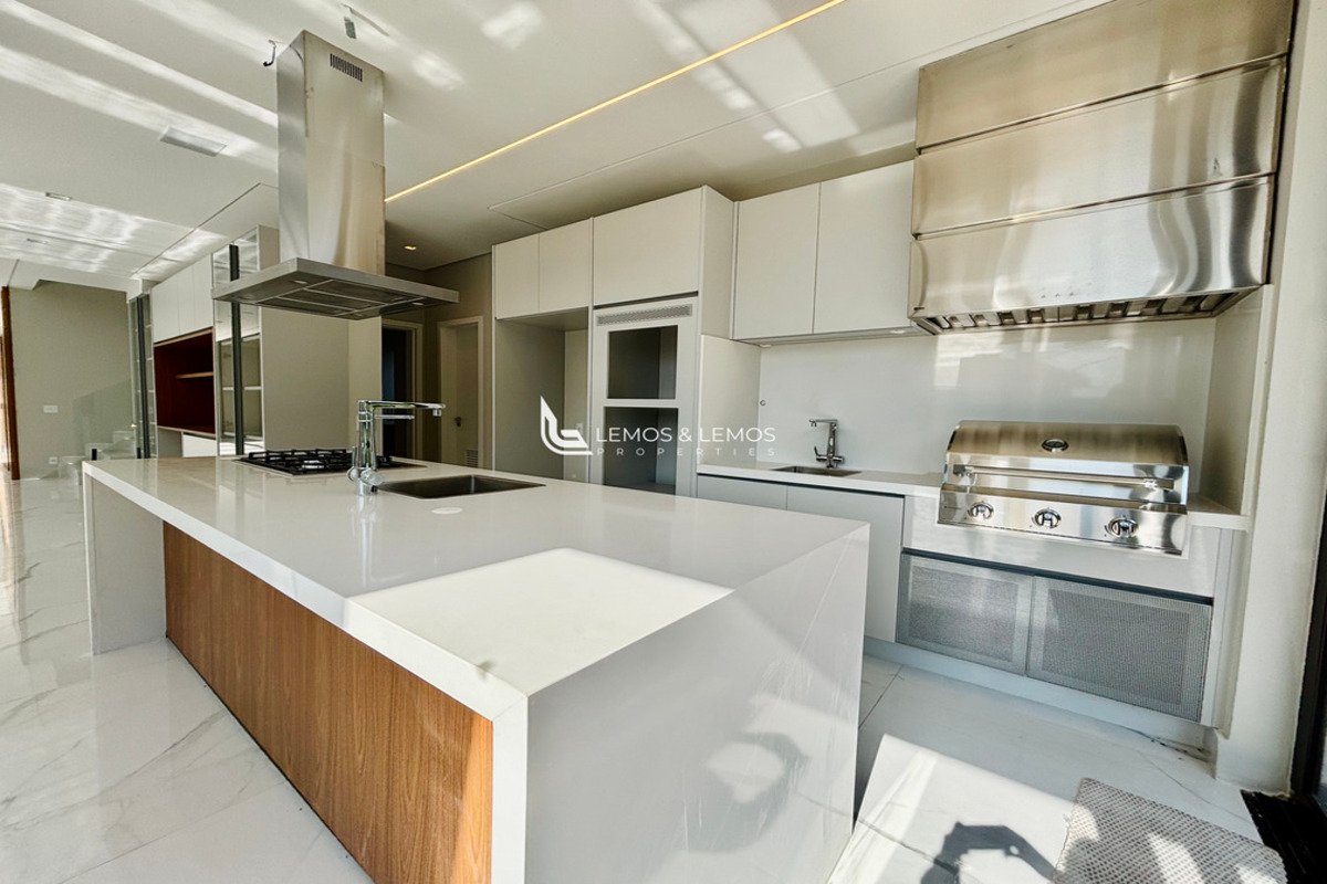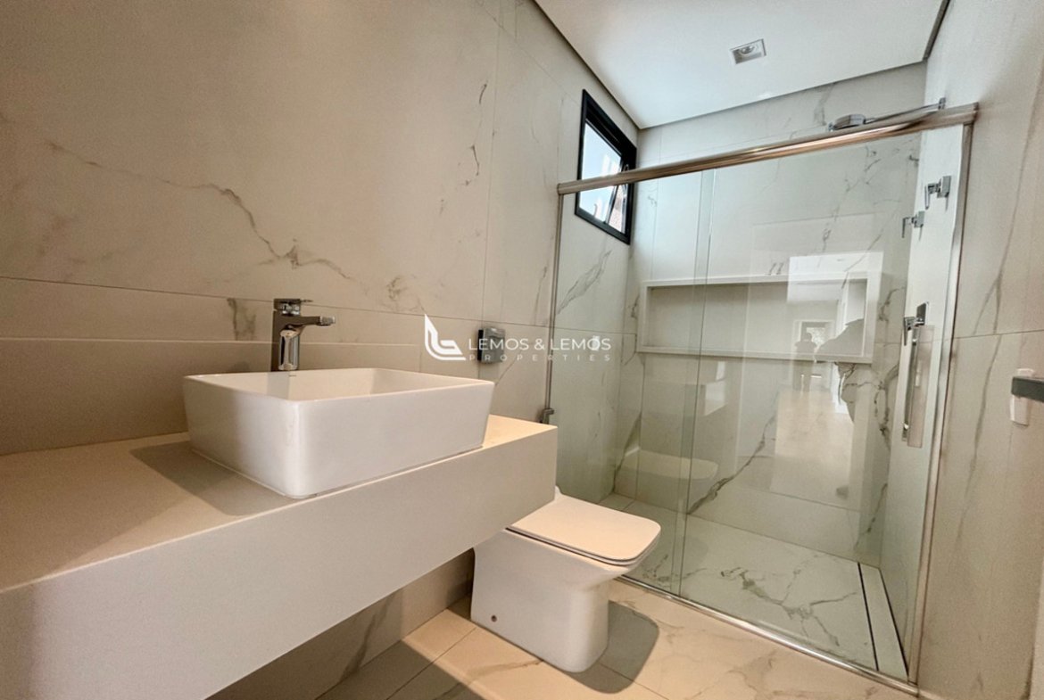 Com 505 m² de terreno e 430 m² de área construída, a casa possui 4 suítes amplas, incluindo uma máster com closet e banheiro Sr. e Sra., living com pé-direito duplo, sala lareira, sala de jantar, escritório, sala íntima, rouparia, além de lavabo e dependência completa para colaborador.