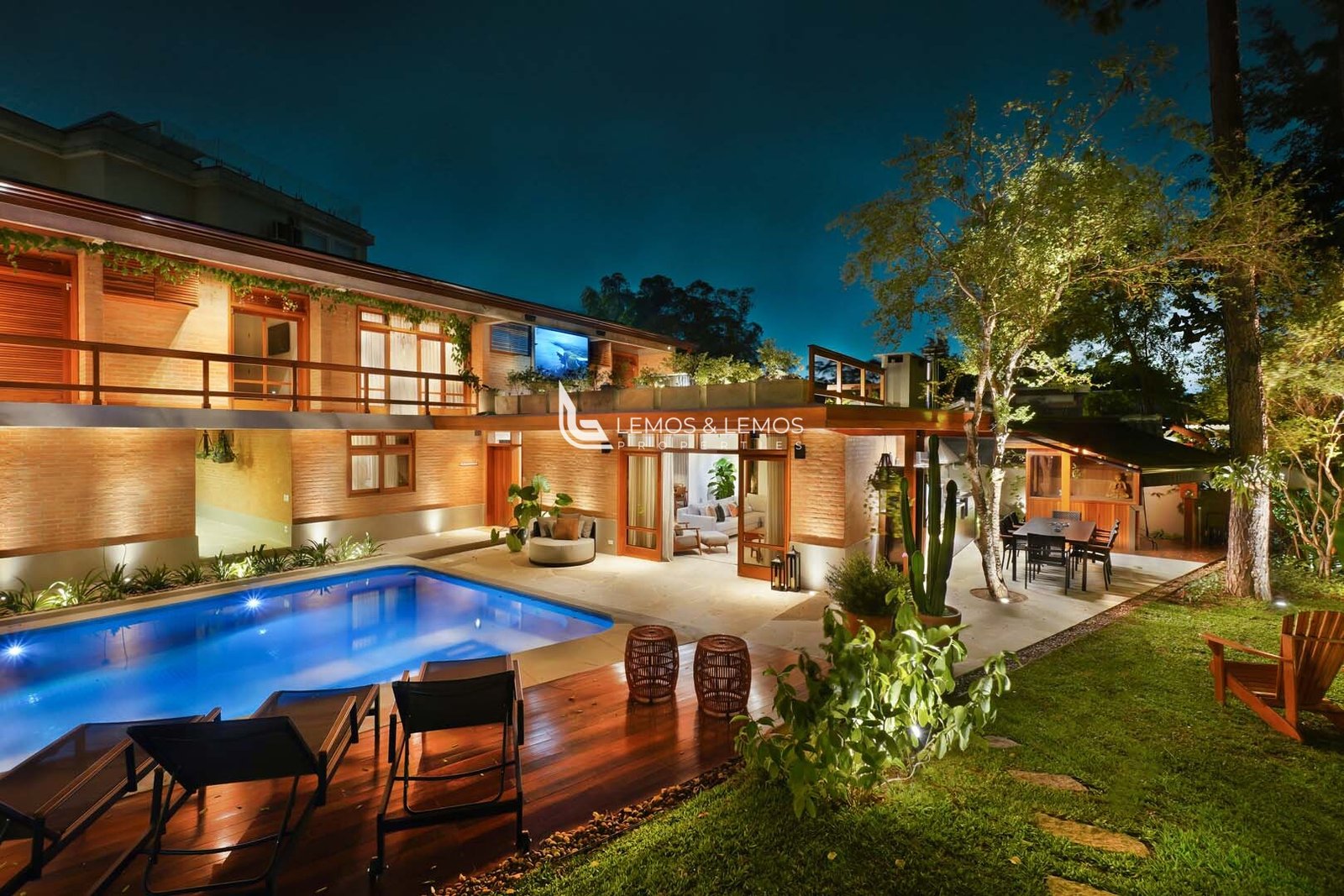 O lazer é completo: piscina automatizada com spa aquecido a gás e hidromassagem, sauna seca, espaço gourmet com churrasqueira parrilla argentina, forno e fogão industriais, cervejeira e som ambiente. O jardim tropical, horta suspensa com irrigação automática, pomar e lareira externa completam o cenário perfeito.